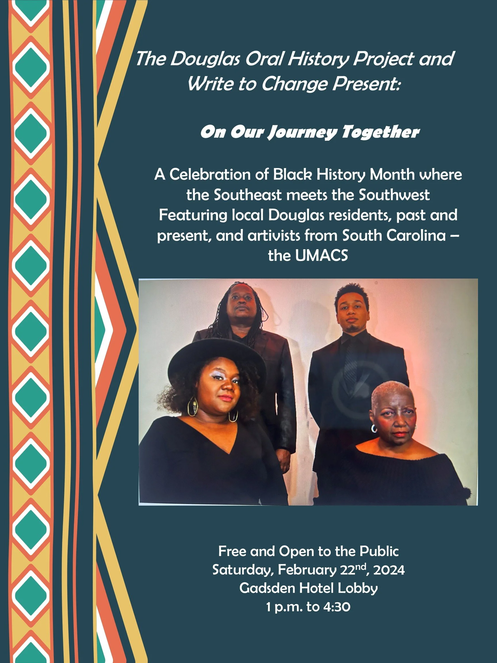 In a joint collaboration, The Douglas Oral History Project and Write to Change presented “On Our Journey Together” an incredible celebration of the Black History Experience in Douglas, AZ and Orangeburg, South Carolina. The celebration began wi6h a private dinner at Cilantros, the former home of the Horace Davis Post #46, also known as the “Colored American Legion.” Dinner, dancing, and a silent auction filled out the evening.